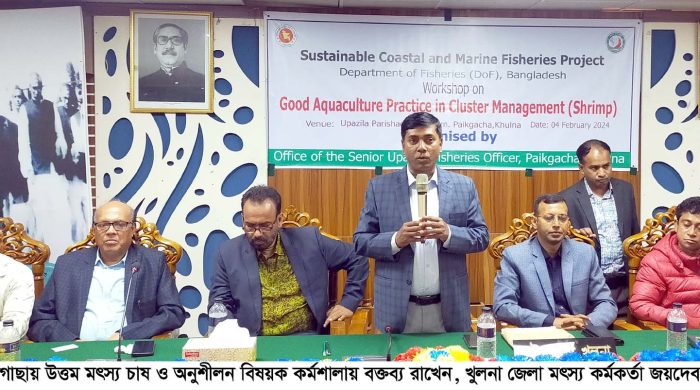 ইমদাদুল হক,পাইকগাছা (খুলনা): পাইকগাছায় চিংড়ি ক্লাস্টার ব্যবস্থাপনা, উত্তম মৎস্য চাষ ও অনুশীলন বিষয়ক কর্মশালা অনুষ্ঠিত হয়েছে। মৎস্য অধিদপ্তরের সাসটেনেবল কোস্টাল এন্ড মেরিন ফিশারিজ প্রকল্পের আওতায় রোববার সকালে উপজেলা পরিষদ মিলনায়তনে সিনিয়র উপজেলা মৎস্য কর্মকর্তার কার্যালয় এ কর্মশালার আয়োজন করে। সিনিয়র উপজেলা মৎস্য কর্মকর্তা রণজিৎ কুমার এর সভাপতিত্বে অনুষ্ঠিত কর্মশালায় প্রধান অতিথি ছিলেন, খুলনা জেলা মৎস্য কর্মকর্তা জয়দেব পাল। বিশেষ অতিথি ছিলেন, উপজেলা ভাইস চেয়ারম্যান শিয়াবুদ্দীন ফিরোজ বুলু, বটিয়াঘাটার সিনিয়র উপজেলা মৎস্য কর্মকর্তা মনিরুল মামুন, নিরিবিলি শ্রিম্প এর টেকনিক্যাল এ্যাডভাইজার মনমথ নাথ সরকার। বক্তব্য রাখেন, মেরিন ফিশারিজ কর্মকর্তা কওছার হোসেন আকন, ক্ষেত্র সহকারী রণধীর সরকার, প্রেসক্লাবের সহ- সভাপতি মোঃ আব্দুল আজিজ, সাংবাদিক ¯েœহেন্দু বিকাশ, ইউপি সদস্য পলাশ রায়, চিংড়ি চাষী গোলক মন্ডল, সিরাজুল ইসলাম, কামাল আহম্মেদ, অতুল, মানষ কুমার ও নারায়ণ সরদার। কর্মশালায় বাগদা চিংড়ির পুরানো ঐতিহ্য ফিরিয়ে আনতে উত্তম মৎস্য চাষ ব্যবস্থাপনার উপর গুরুতারোপ করেন অতিথিবৃন্দ। কর্মশালায় উপজেলার বিভিন্ন ক্লাস্টারের চিংড়ি চাষীরা অংশগ্রহণ করেন।