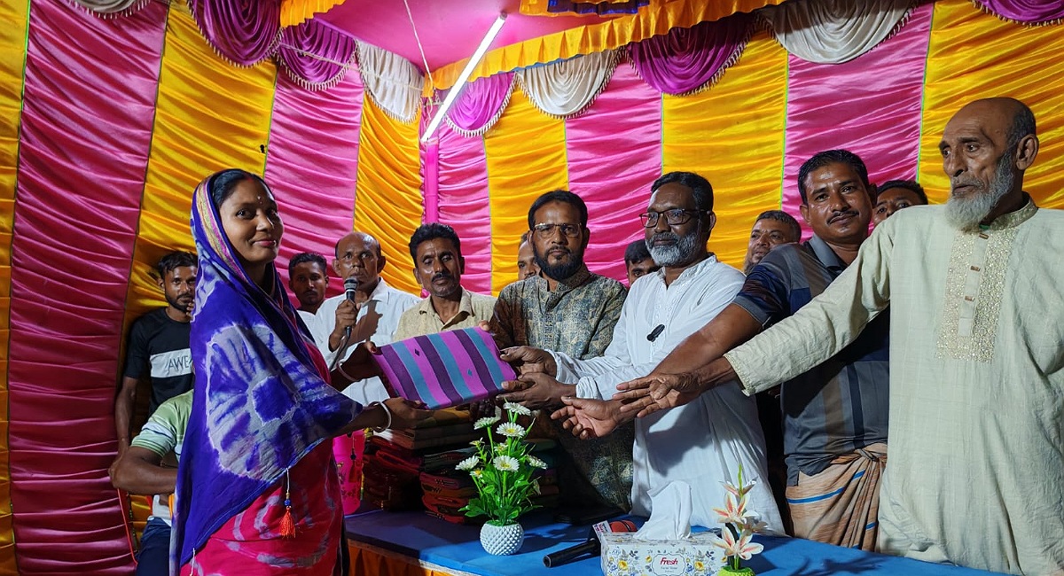 মহিলাদের মাঝে শাড়ি কাপড় বিতরণ করেন।।