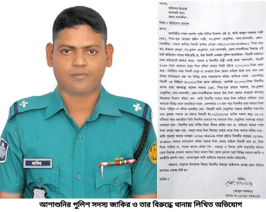 আশাশুনিতে পুলিশ সদস্যের বিরুদ্ধে দুর্নীতির অভিযোগ এনে থানায় লিখিত অভিযোগ করা হয়েছে। উপজেলার ব্রাহ্মন তেতুলিয়া গ্রামের মৃত মছেলউদ্দীন গাজীর ছেলে আঃ গফফার বাদী হয়ে শনিবার (২ নভেম্বর) থানায় লিখিত অভিযোগ করেন।