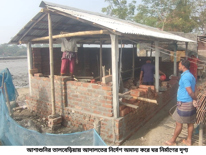 আশাশুনির তালবেড়িয়ায় আদালতের নির্দেশ অমান্য করে ঘর নির্মাণের অভিযোগ পাওয়া গেছে। এ ঘটনাটি ঘটেছে বৃহস্পতিবার বেলা ১১টায় উপজেলার কাদাকাটি ইউনিয়নের তালবেড়িয়া গ্রামে।