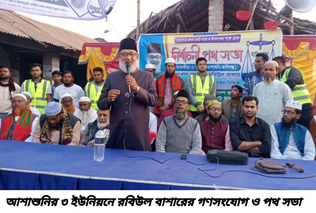 সাতক্ষীরা-৩ (আশাশুনি-কালিগঞ্জ) আসনের ১০ দলীয় জোট ও জামায়াতে ইসলামী মনোনীত এমপি প্রার্থী মুহাদ্দিস রবিউল বাশারের দাড়িপাল্লা প্রতীকের পক্ষে গণসংযোগ ও পথ সভা অনুষ্ঠিত হয়েছে। রবিবার (২৫ জানুয়ারী) উপজেলার আশাশুনি সদর, বড়দল ও কাদাকাটি ইউনিয়নে এ কর্মসূচির আয়োজন করা হয়।