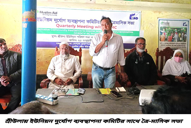 মুসলিম এইড ইউকে বাংলাদেশ ফিল্ড অফিস (MABFO)-এর সহযোগিতায় ইকো সোশ্যাল ডেভেলপমেন্ট অর্গানাইজেশন (ESDO) কর্তৃক বাস্তবায়নাধীন ইনক্লুসিভ কমিউনিটি রেজিলিয়েন্স টু ডিজাস্টার অ্যান্ড ক্লাইমেট ভালনারেবিলিটিজ (ICRDCV-III) প্রকল্পের আয়োজনে সভায় সভাপতিত্ব করেন, ইউপি চেয়ারম্যান প্রভাষক দীপংকর বাছার দীপু।