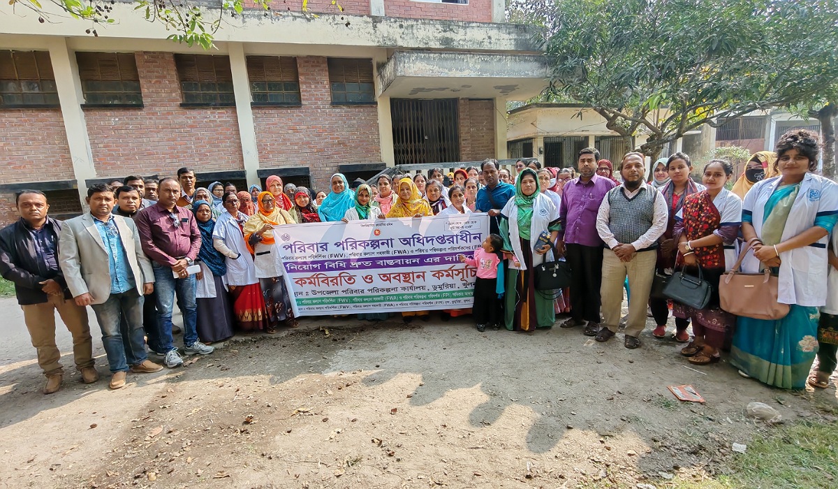 মঙ্গলবার সকাল থেকে উপজেলা পরিবার পরিকল্পনা কার্যালয়ের সামনে কর্মবিরতি ও অবস্থান কর্মসূচি পালিত হয়।