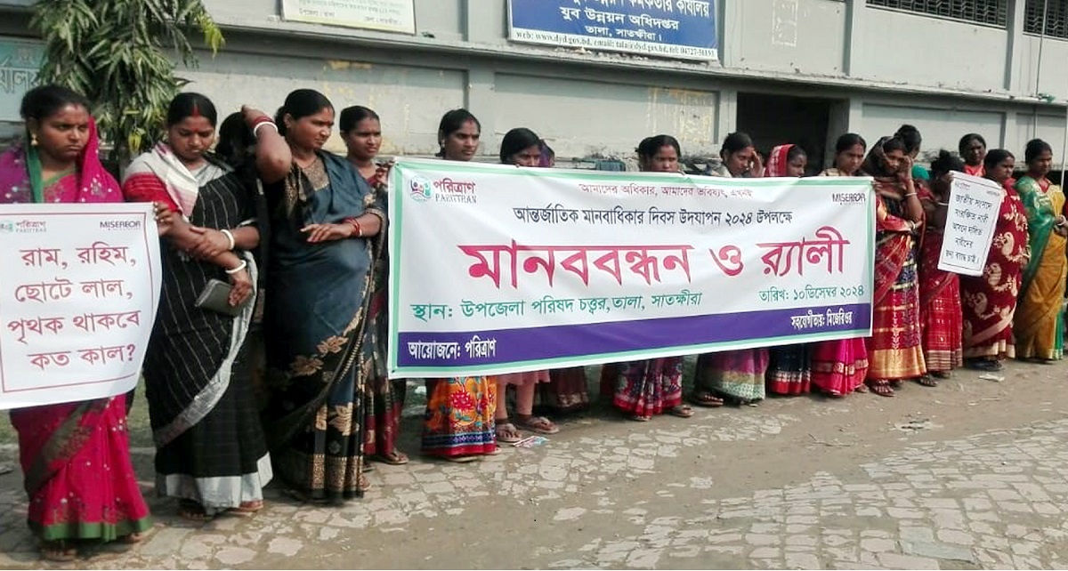 আমাদের অধিকার, আমাদের ভবিষ্যৎ, এখনই- প্রতিপাদ্য ¯েøাগান সামনে রেখে সাতক্ষীরার তালায় আন্তর্জাতিক মানবাধিকার দিবস-২৪ পালিত হয়েছে। দিবসটি পালনে মঙ্গলবার ১০ ডিসেম্বর সকালে র্যালী, মানববন্ধন ও আলোচনা সভা অনুষ্ঠিত হয়। দাতা সহযোগী মিজেরিওর এর সহযোগীতায়, প্রোমোটিং রাইটস অফ দলিত ইন বাংলাদেশ (পিআরডিবি) প্রকল্পের আওতায় বেসরকারি সংগঠন পরিত্রাণ দিবসটি পালনে নানাবিধ কর্মসূচীর আয়োজন করে।