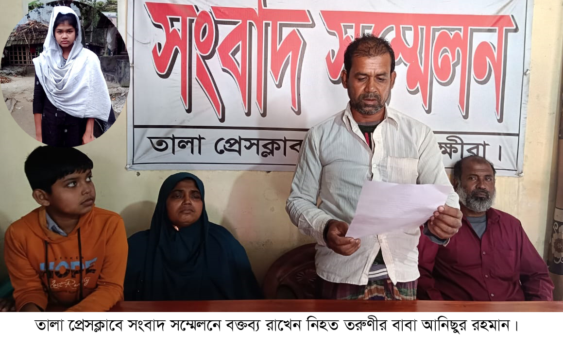 সাতক্ষীরার তালায় যৌতুকের দাবিতে নির্যাতনের পর এক তরুণীকে হত্যার অভিযোগ উঠেছে। এ ঘটনায় নিহতের বাবা বৃহস্পতিবার (৪ ডিসেম্বর) দুপুর ১২টার সময় তালা প্রেসক্লাবে সংবাদ সম্মেলন করে দোষীদের দৃষ্টান্তমূলক শাস্তির দাবি জানিয়েছেন।