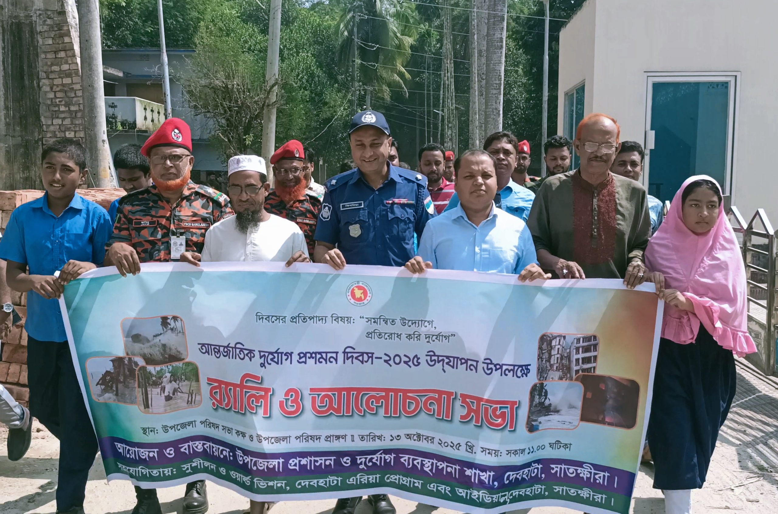 "সমন্বিত উদ্যোগে, প্রতিরোধ করি দুর্যোগ" এই প্রতিপাদ্য বিষয়কে সামনে রেখে দেবহাটায় আন্তর্জাতিক দুর্যোগ প্রশমন দিবস-২০২৫ উদযাপন উপলক্ষ্যে র্যালি ও আলোচনা সভা অনুষ্ঠিত হয়েছে। উপজেলা প্রশাসন এবং দূর্যোগ ব্যবস্থাপনা শাখার আয়োজন ও বাস্তবায়নে উক্ত অনুষ্ঠানে সভাপতিত্ব করেন দেবহাটা উপজেলা নির্বাহী অফিসার মিলন সাহা।