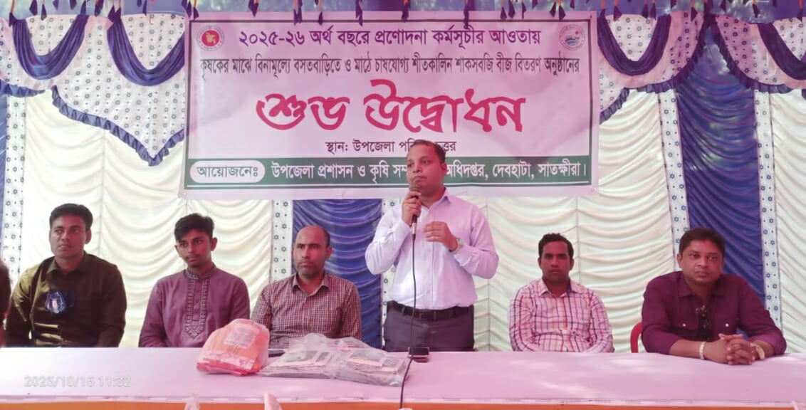 উপজেলা অফিসার্স ক্লাবের সামনে ২০২৫-২৬ অর্থবছরে প্রনোদনা কর্মসূচীর আওতায় কৃষকদের মাঝে বিনামূল্যে বসতবাড়িতে ও মাঠে চাষযোগ্য শীতকালীন সবজি বীজ ও সার বিতরন অনুষ্ঠানে সভাপতিত্ব করেন দেবহাটা উপজেলা কৃষি অফিসার শওকত ওসমান।