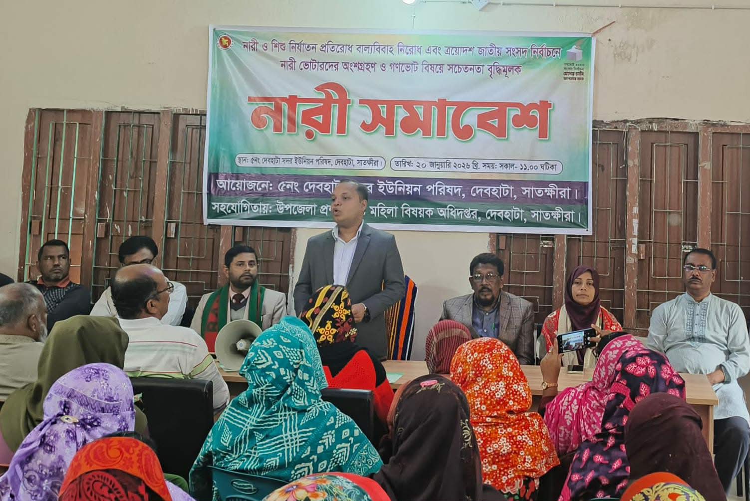 দেবহাটায় আগামী ত্রয়োদশ জাতীয় সংসদ নির্বাচনে গনভোট সম্পর্কে সাধারন মানুষ ও মহিলাদেরকে অবহিত করতে এবং বাল্য বিবাহ নিরোধ বিষয়ে সচেতনতামূলক মহিলা সমাবেশে মিলিত হয়েছেন দেবহাটা উপজেলা নির্বাহী অফিসার মিলন সাহা।