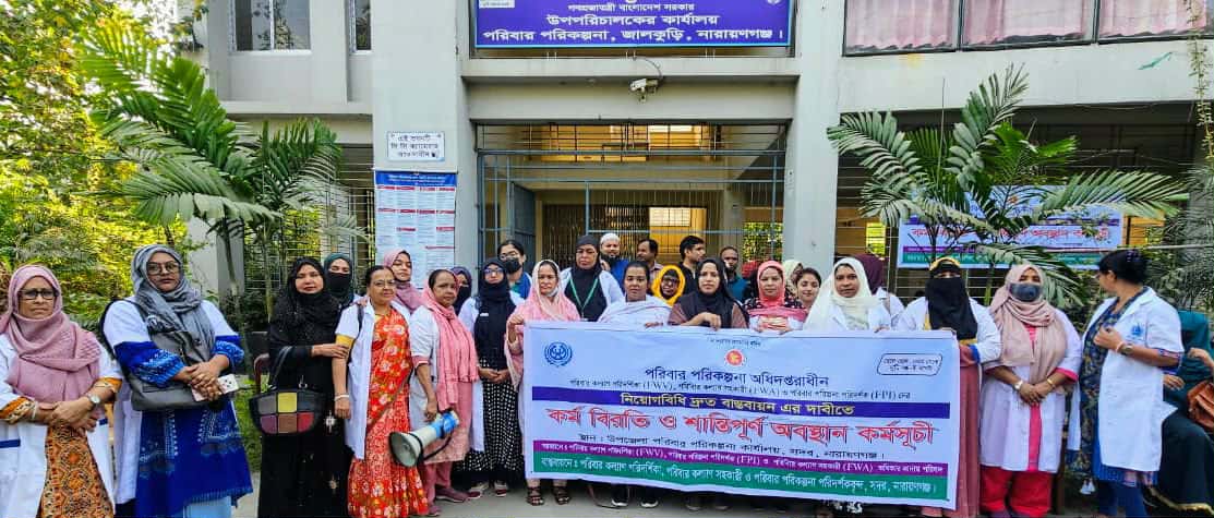 নিয়োগবিধি দ্রুত বাস্তবায়নের দাবিতে নারায়ণগঞ্জ সদর উপজেলা পরিবার পরিকল্পনা বিভাগের কর্মীরা ৩য় দিনও কর্মবিরতি ও শান্তিপূর্ণ অবস্থান কর্মসূচি পালন করেছেন।
