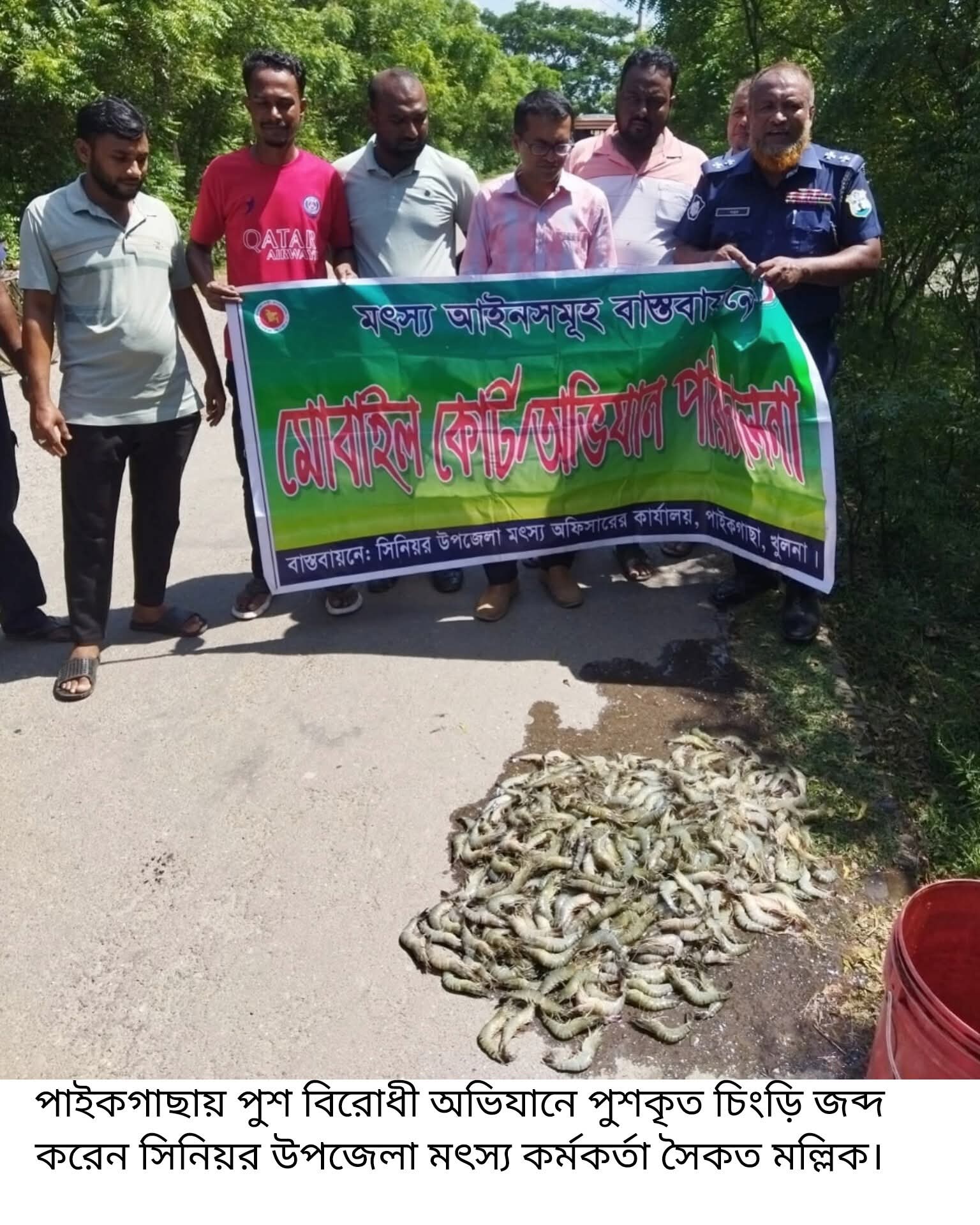 বৃহস্পতিবার দুপুরে সিনিয়র উপজেলা মৎস্য কার্যালয় থেকে উপজেলার ভিলেজ পাইকগাছায় পুশ বিরোধী অভিযান পরিচালনা করা হয়।