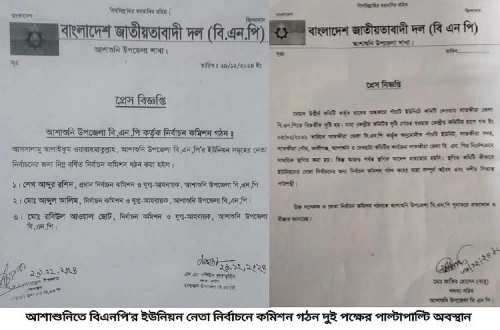 বাংলাদেশ জাতীয়তাবাদী দল (বিএনপি) আশাশুনি উপজেলা শাখা (একাংশ) কর্তৃক ইউনিয়ন নেতা নির্বাচনের জন্য গত ২৯ ডিসেম্বর নির্বাচন কমিশন গঠন করা হয়। উক্ত কমিশন গঠনের একদিন পর অপর অংশ কর্তৃক উক্ত কমিশন অবৈধ এবং দলীয় সিদ্ধান্ত পরিপন্থী উল্লেখ করে প্রত্যাখ্যান করেছেন।