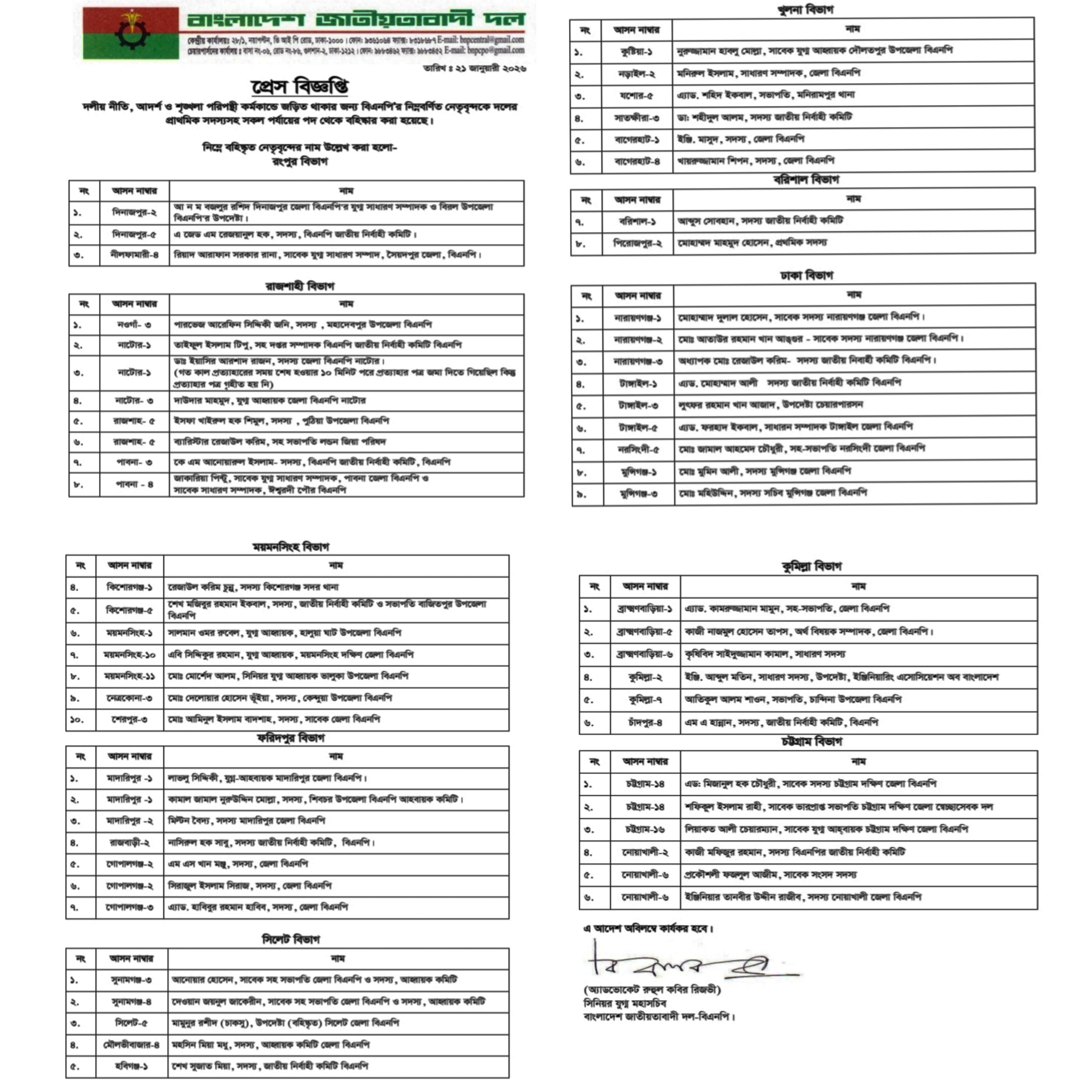 বুধবার (২১ জানুয়ারি) রাতে দলের দলটির সিনিয়র যুগ্ম মহাসচিব রুহুল কবির রিজভীর সই করা এক সংবাদ বিজ্ঞপ্তিতে এই তথ্য জানানো হয়েছে।