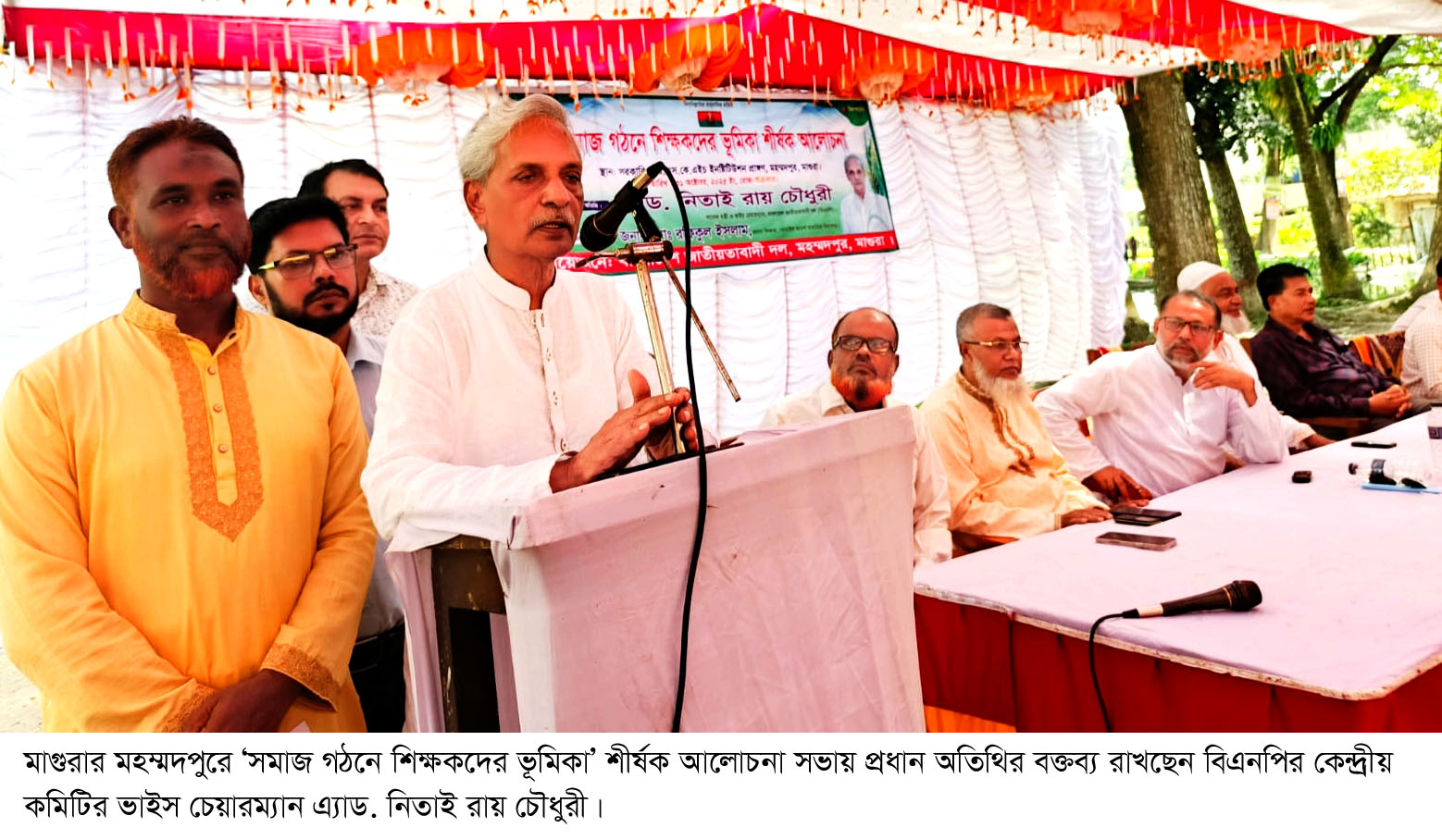 মাগুরার মহম্মদপুরে 'সমাজ গঠনে শিক্ষকদের ভূমিকা' শীর্ষক আলোচনা সভা অনুষ্ঠিত হয়েছে। এই আলোচনা সভায় প্রধান অতিথির বক্তব্যে বিএনপি'র কেন্দ্রীয় কমিটির ভাইস চেয়ারম্যান, সাবেক মন্ত্রী এ্যাড. নিতাই রায় চৌধুরী শিক্ষকদের উদ্দেশ্যে বলেন- আপনারা আমাদের গুরুজন, শিক্ষকের তুলনা শুধু শিক্ষকই। শিক্ষকরাই পারেন সমাজকে সঠিকভাবে বির্নিমান করতে। আসুন আমরা দেশটাকে সুন্দরভাবে গড়ে তুলি। আমার সব ধ্যান ধারণা গ্রাম নিয়ে, কারণ আমি গ্রামেরই সন্তান। একজন মা যেমন সন্তান প্রসব করে আনন্দ পান। তেমনি একজন শিক্ষক তার ছাত্রকে সুশিক্ষায় শিক্ষিত করতে পারলে আনন্দ পান।