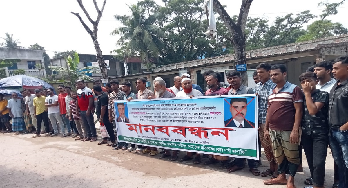 আলহাজ্ব আলমগীর হোসেন এর নেতৃত্বে এ মানববন্ধন অনুষ্ঠিত হয় তিনি বলেন আমার পৈত্রিক ও কোবলাকৃত সম্পত্তি জবর দখলের হুমকি ও পায়তারা করিতেছে। গত ১৮ সেপ্টেম্বর সাইফুল্ল্যাহ ও আবুল কাশেমের নেতৃত্বে ভুয়া ভূমিহীনদের নিয়ে আমার নামে ও আমার ভাইদের নামে মিথ্যা,বানোয়াট মানববন্ধন করেছে।