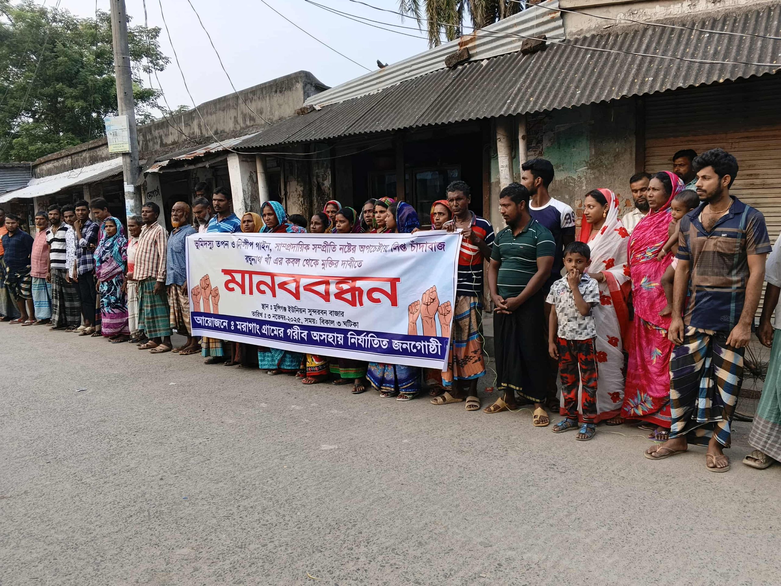 বর্তমানে তারা নিরাপত্তাহীনতায় জীবনযাপন অতিবাহিত করছে। এ ঘটনায় মরাগাং গ্রামের গরিব অসহায় নির্যাতিত জনগোষ্ঠীর আয়োজনে গতকাল ৩ নভেম্বর বিকাল ৩ টায় মুন্সিগঞ্জ ইউনিয়ন সুন্দরবন বাজারে মানববন্ধন করেন।