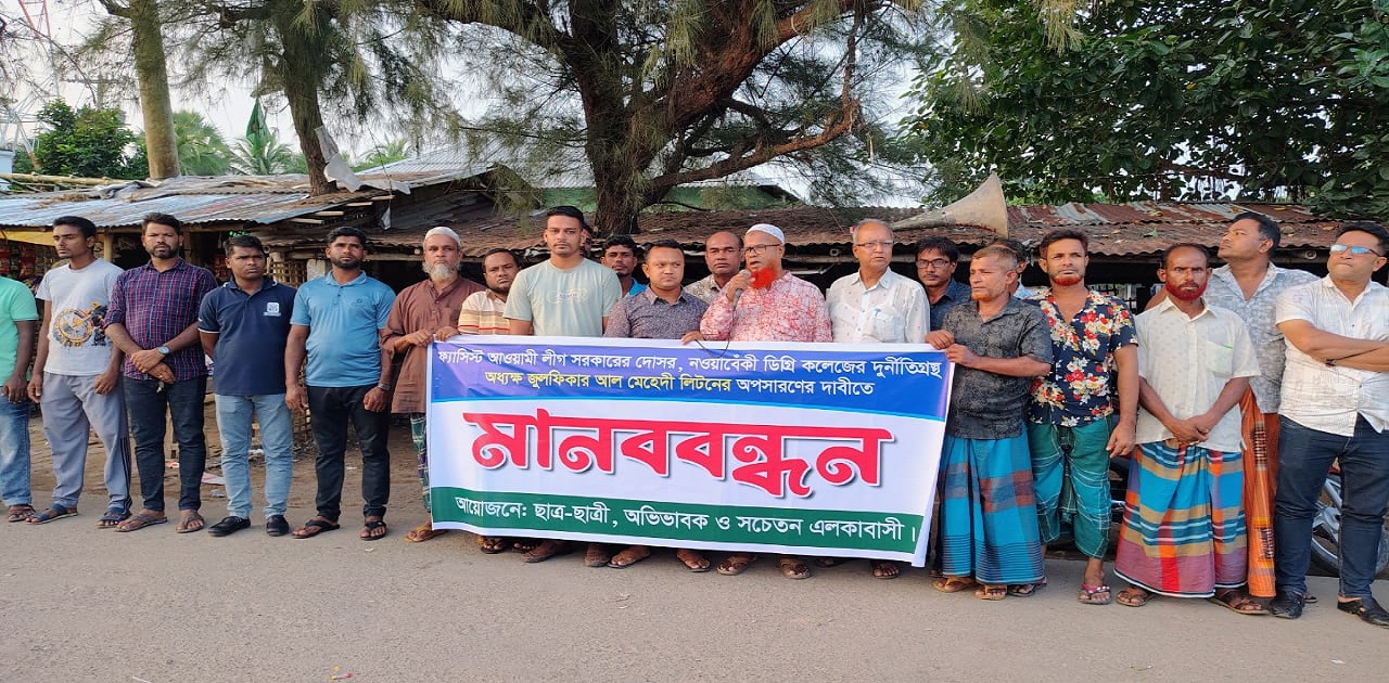 মানববন্ধনে বক্তারা, বলেন নওয়াবেঁকী মহাবিদ্যালয়ের অধ্যক্ষ জুলফিকার আল মেহেদী লিটনের বিরুদ্ধে অর্থ আত্মসাৎ, শিক্ষক ও শিক্ষার্থীদের প্রতি অসদাচরণ, স্বেচ্ছাচারিতা, কলেজে অনিয়মিত আগমন, প্রস্থান, সভাপতি নির্বাচন সহ বিভিন্ন অনিয়ম ও দুর্নীতির অভিযোগ তুলে তার অপসরণের দাবি করেন। এবং অধ্যক্ষের অপসরণের জন্য প্রশাসনের দ্রুত হস্তক্ষেপ কামনা করেন। অন্যথায় কঠোর আন্দোলন হবে বলে হুঁশিয়ারিদেন।