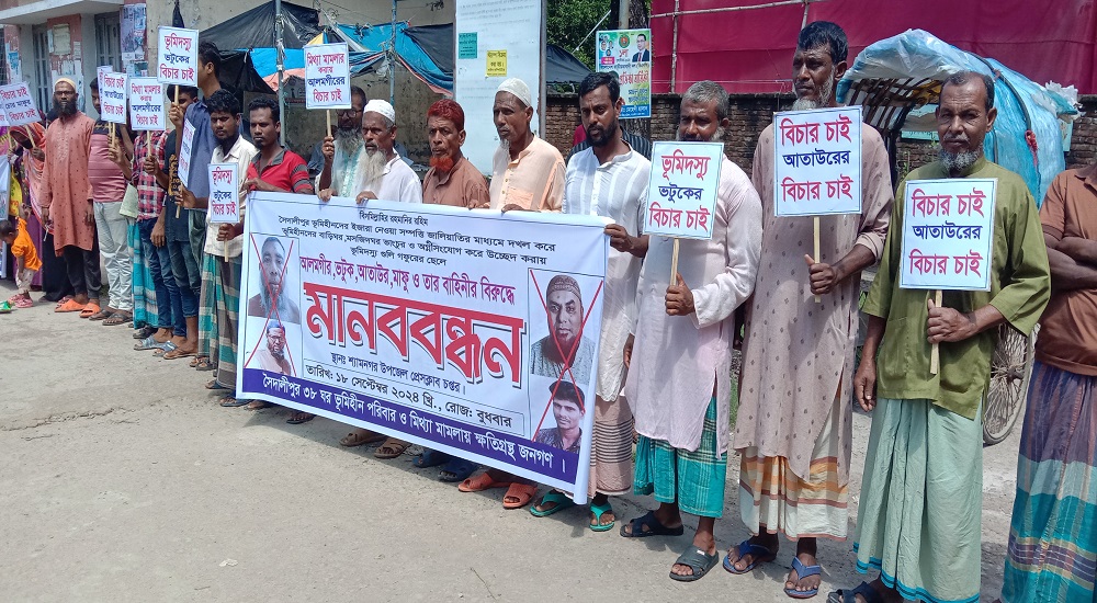 শ্যামনগরে সৈদালীপুর ভূমিহীনদের ইজারা নেওয়া সম্পত্তি জালিয়াতির মাধ্যমে দখল করে ভূমিহীনদের বাড়িঘর মসজিদ ঘর ভাংচুর ও অগ্নিসংযোগ করে উচ্ছেদ করায় ও মিথ্যা মামলা থেকে রেহায় পেতে ভূমিদস্যু গুলি গফুরের ছেলে আলমগীর ও ভটুক বাহিনীর বিরুদ্ধে শ্যামনগরে মানববন্ধন করেছে ভূমিহীনরা। ১৮ই সেপ্টেম্বর বুধবার বেলা ১১ টায় শ্যামনগর উপজেলা প্রেসক্লাবের সামনে সৈদালীপুর ৩৮ ঘর ভূমিহীন ও মিথ্যা মামলায় ক্ষতিগ্রস্ত জনগণের আয়োজনে মানববন্ধন অনুষ্ঠিত হয়।