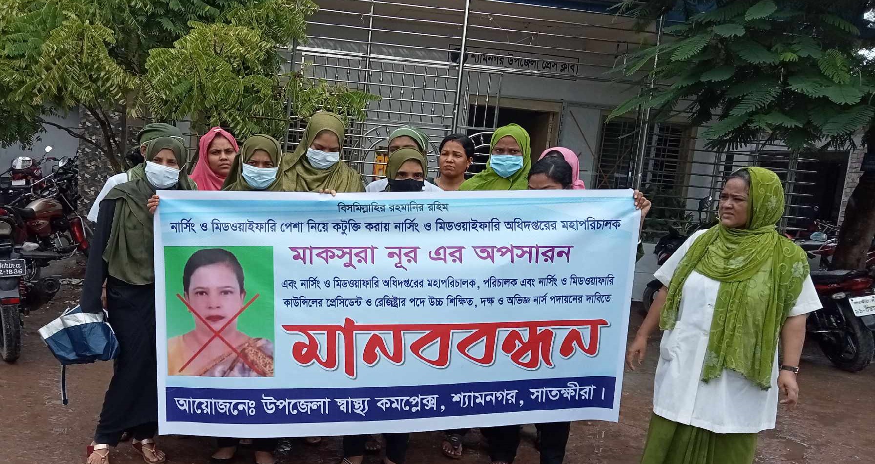 নার্সিং ও মিডওয়াইফারি পেশা নিয়ে কটুক্তি করায় মিডওয়াইফারি অধিদপ্তরের মহাপরিচালক মাকসুরা নূর এর অপসারন ও নার্সিং মিডওয়াফারি অধিদপ্তরের মহাপরিচালক,পরিচালক এবং নার্সিং ও মিডওয়াফারি কাউন্সিলের প্রেসিডেন্ট ও রেজিস্ট্রার পদে উচ্চ শিক্ষিত, দক্ষ ও অভিজ্ঞ নার্স পদায়নের দাবিতে শ্যামনগরে মানববন্ধন অনুষ্ঠিত হয়েছে।