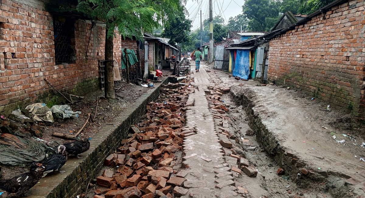 (৮ই আগস্ট) শুক্রবার সকালে সরজমিনে গিয়ে দেখা যায়,রাস্তার ওপর ছড়িয়ে-ছিটিয়ে আছে ভাঙা ইট, পাশে সৃষ্টি হয়েছে গভীর গর্ত। বৃষ্টির পানিতে কাদা জমে চলাচল হয়ে উঠেছে দুর্বিষহ। ছোট ছোট শিশু থেকে শুরু করে বৃদ্ধরা প্রতিদিন জীবনের ঝুঁকি নিয়ে যাতায়াত করছেন এই ভাঙাচোরা পথে।