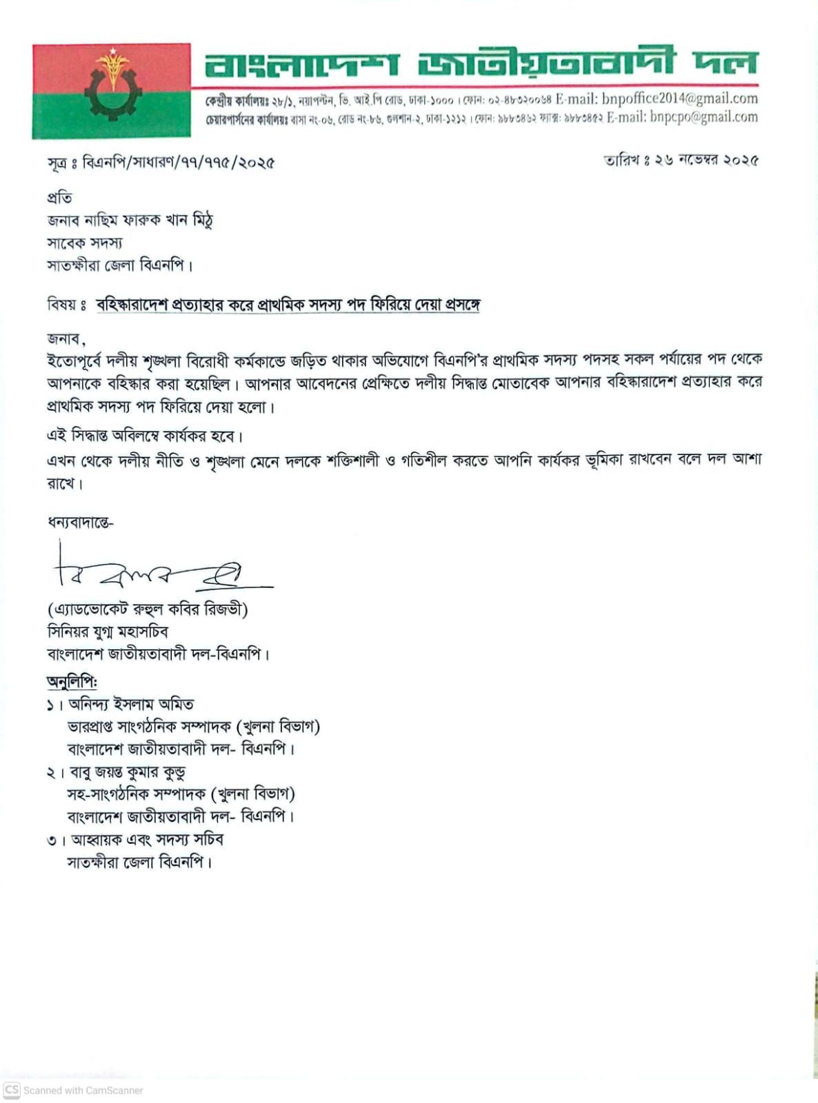 বাংলাদেশ জাতীয়তাবাদী দল (বিএনপি) সাতক্ষীরার সাবেক জেলা কমিটির সদস্য ও জেলা যুবদলের সাবেক সাধারণ সম্পাদক নাছিম ফারুক খান মিঠুর বহিষ্কারাদেশ প্রত্যাহার করেছে। দলীয় শৃঙ্খলাভঙ্গের অভিযোগে আগে দেওয়া বহিষ্কারাদেশ পুনর্বিবেচনার পর তাঁর প্রাথমিক সদস্যপদ ফিরিয়ে দেওয়া হয়েছে।