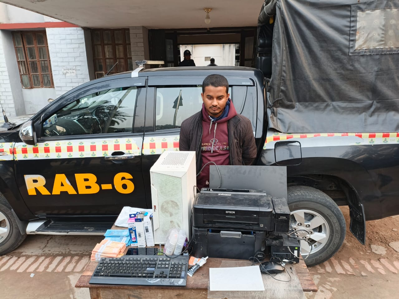 যশোরের কেশবপুর থানাধীন মাগুরখালী বাজারে অভিযান চালিয়ে ৮১ হাজার ৮০০ টাকা জাল নোট এবং জাল টাকা তৈরির সরঞ্জামসহ একজনকে গ্রেফতার করেছে র্যাব-৬।