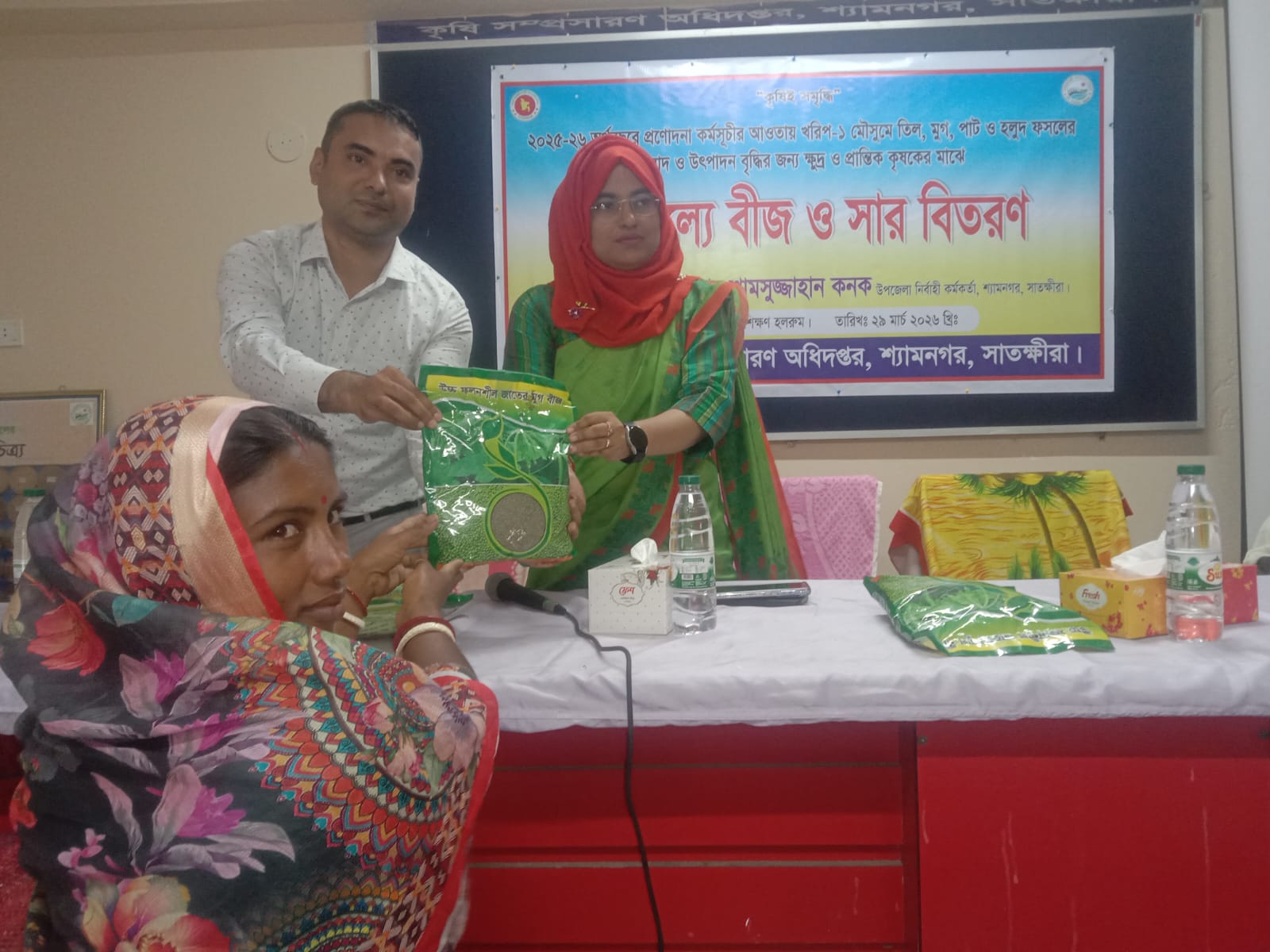 ২৯ মার্চ (রবিবার) শ্যামনগরের উপজেলা কৃষক প্রশিক্ষণ হলরুমে উপজেলা নির্বাহী অফিসার শামসুজ্জাহান কনক এর সভাপতিত্বে কৃষি সম্প্রসারণ অধিদপ্তরের বাস্তবায়নে কৃষি অফিসার ওয়ালিউল ইসলাম এর সঞ্চালনায় শ্যামনগর উপজেলা প্রেস ক্লাবের সেক্রেটারী এস, এম, মোস্তফা কামাল এর উপস্থিতিতে তিল, মুগ, পাট, হলুদ বীজ ও সার প্রায় ২শত কৃষকের মাঝে বিনামূল্যে বিতরণ করা হয়েছে।