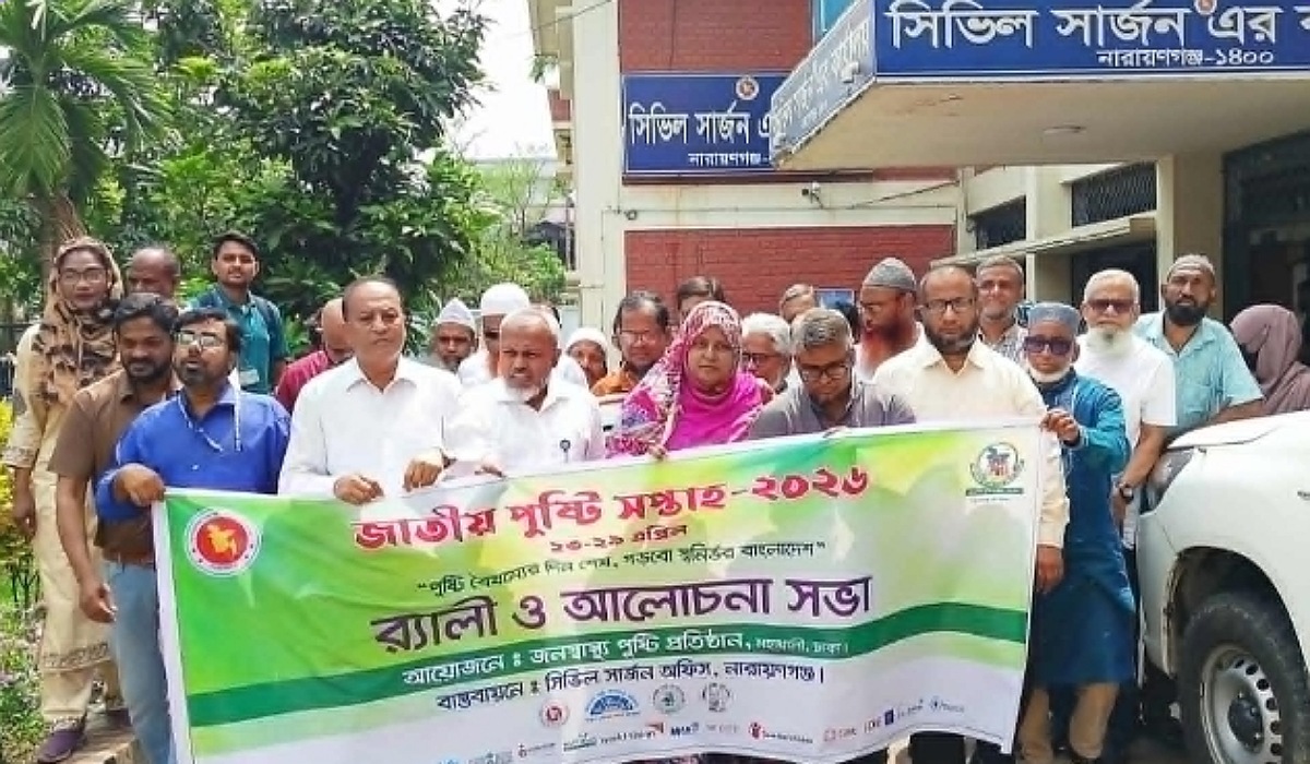 "পুষ্টি বৈষম্যের দিন শেষ, গড়বো স্বনির্ভর বাংলাদেশ" এই প্রতিপাদ্যে জেলা সিভিল সার্জন কার্যালয়ের আয়োজনে র্যালি ও আলোচনা সভার মধ্য দিয়ে নারায়ণগঞ্জে (২৩-২৯ এপ্রিল) জাতীয় পুষ্টি সপ্তাহ-২০২৬ উদ্বোধন করা হয়েছে।