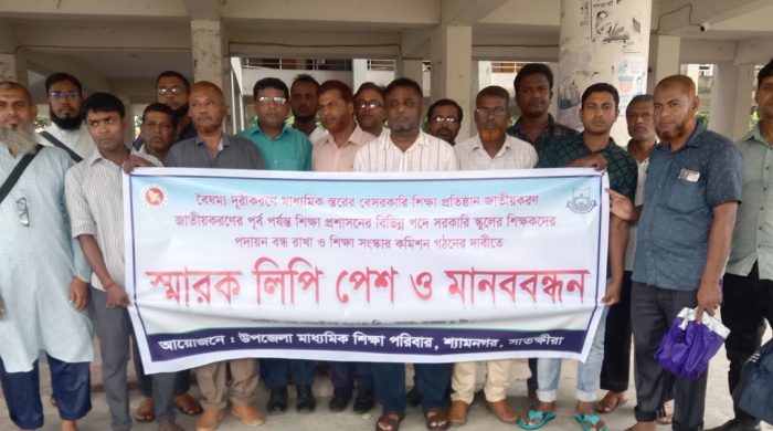 বেসরকারি শিক্ষা প্রতিষ্ঠান জাতীয়করণ আতীয়করণের পূর্ব পর্যন্ত শিক্ষা প্রশাসনের বিভিন্ন পদে সরকারি স্কুলের শিক্ষকদের পদায়ন বন্ধ রাখা ও শিক্ষা সংস্কার কমিশন গঠনের দাবীতে সাতক্ষীরার শ্যামনগরে মানববন্ধন ও স্মারক লিপি প্রদান